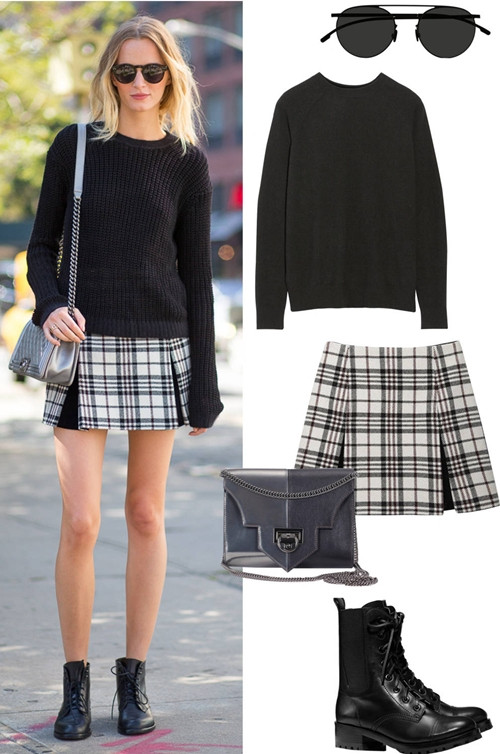 Chân dài xứ bạch dương Daria Stroukus mang đến hơi hướng thời trang thập niên 90 cùng váy mini kẻ caro, áo len cổ điển và bốt da.