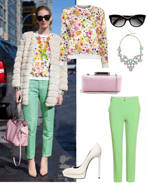 Thời tiết se lạnh không thể ngăn cản phái đẹp diện đồ rực rỡ. Fashionista trên đường phố New York "thắp sáng" phong cách bằng áo họa tiết hoa, quần ống đứng gam xanh bạc hà, phối áo lông màu kem và túi hồng pastel.