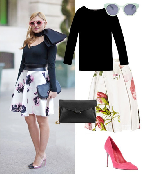 Blogger người Nga Nasiba Adilova lãng mạn, quý phái trong phong cách retro. Cô mix váy hoa xòe kết đôi áo len đen, khăn thắt nơ to bản điệu đà.