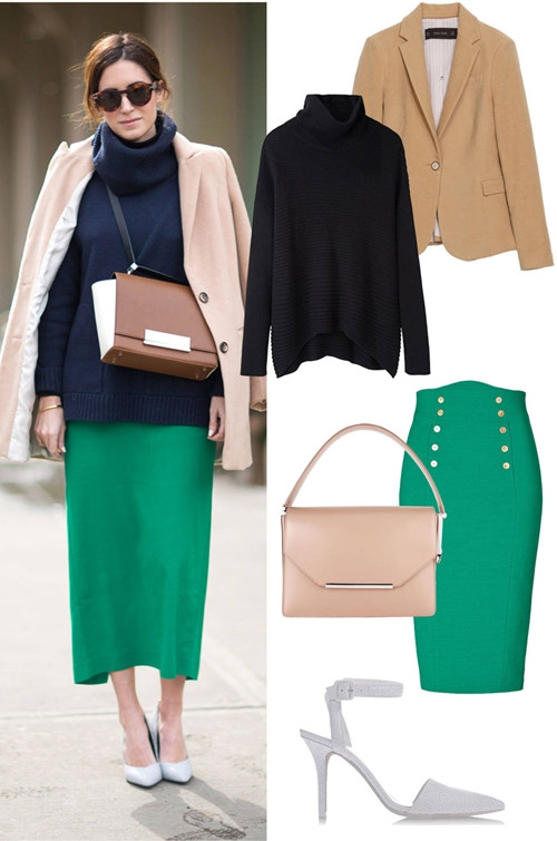 Sự hòa trộn của 4 tông màu navy, camel (lạc đà), xanh lá và trắng tạo thành một set đồ hoàn hảo, nhã nhặn cho các quý cô để đến công sở trong ngày gió.