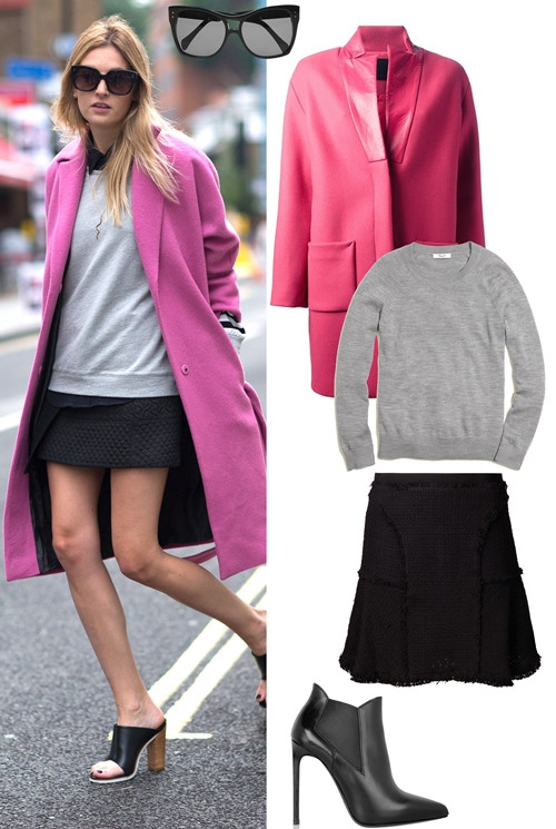 Áo dạ màu nổi "làm bạn" cùng tông đen và xám sẽ giúp tổng thể phong cách cân bằng như blogger Camille Charriere.