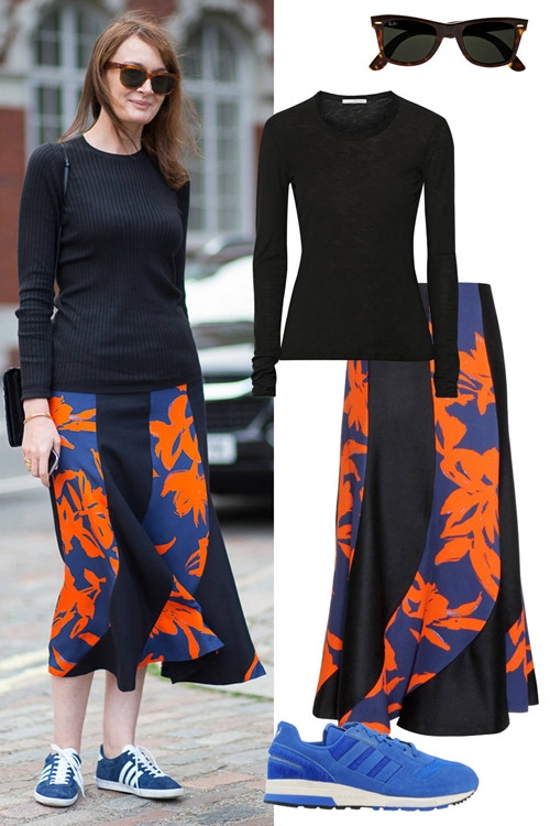 Trong khi đó, một tín đồ thời trang London vừa thanh lịch, vừa khỏe khoắn khi kết hợp áo len với váy midi họa tiết và giày thể thao, làm nên dấu ấn khác biệt cho vẻ ngoài.