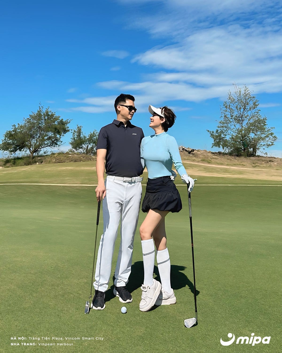 | Doanh nhân - Diễn viên Hoàng Kim Ngọc và chồng yêu thích ứng dụng các bộ trang phục golf thoải mái khi cùng lên sân golf và đi du lịch tại Hội An. |