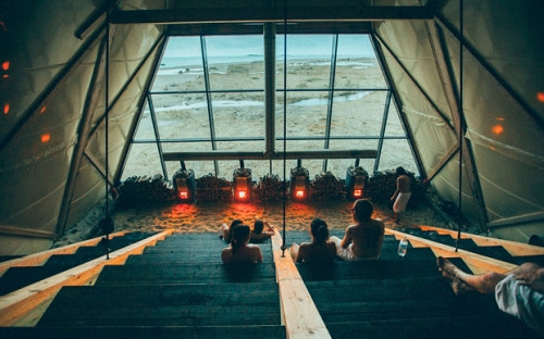 Phần cửa kính phía trước của phòng tắm mang đến du khách một chỗ ngắm cảnh tuyệt vời. Ngồi bên trong bạn có thể nhìn thấy biển Bắc Băng Dương và phong cảnh núi non của hòn đảo.