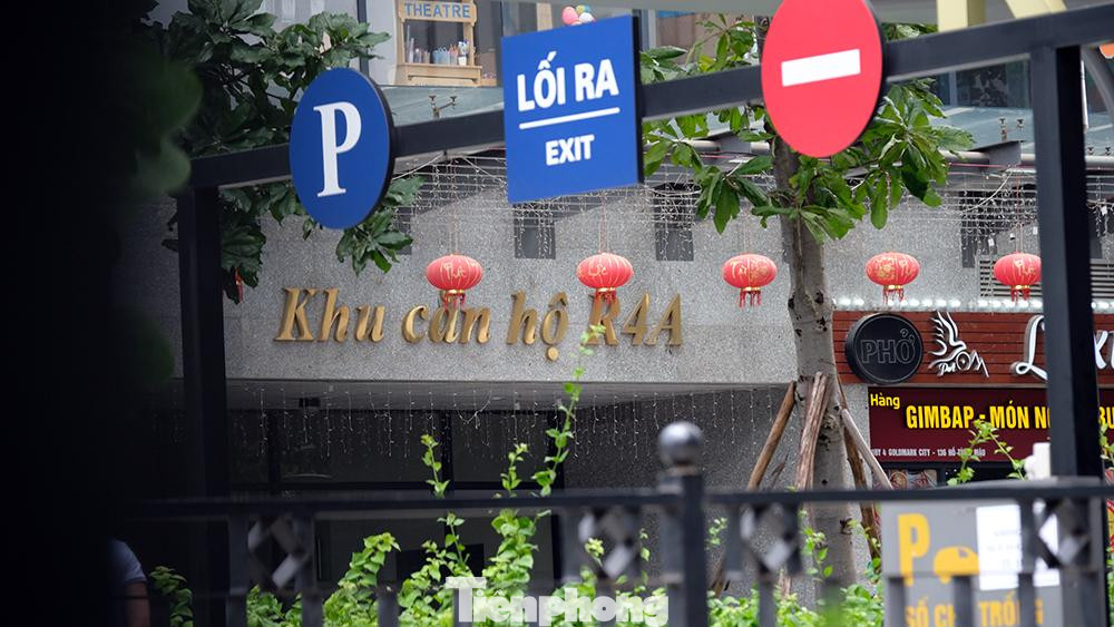 | Lực lượng chức năng dựng 2 nhà bạt trực chỉ huy, phân luồng giao thông kiểm soát người ra vào; nhân viên y tế phun khử khuẩn sân chung cư R4A, tầng 23, các tầng chung cư liên quan F1. |