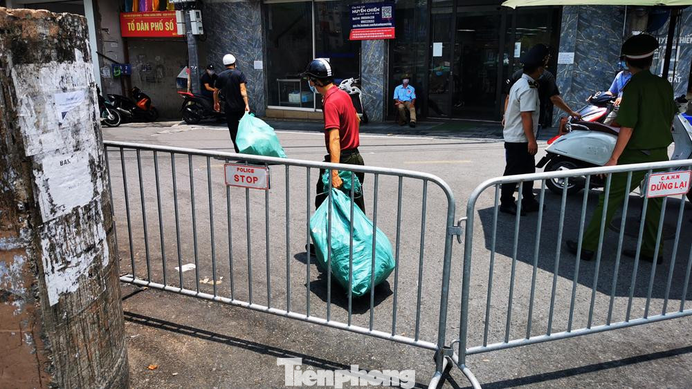 Dù giữa trưa nắng, ở chốt kiểm soát ở đầu phố Cầu Đất vẫn có rất nhiều người chuyên chở hàng hóa đến tiếp tế vào trong.