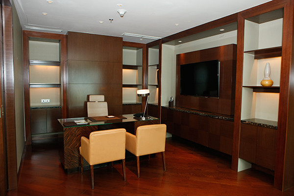 Phòng làm việc được thiết kế đặt giữa phòng khách và phòng ngủ, với bàn làm việc rộng rãi, được trang bị các thiết bị điện tử, viễn thông hiện đại để phục vụ công việc.