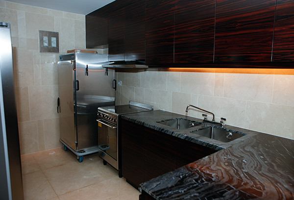Phòng bếp với đầy đủ các thiết bị như tủ đá, tủ lạnh, máy rửa bát, ly chén... Căn phòng này cũng có cửa đi đặc biệt cho nhân viên phục vụ khi có sự cố.