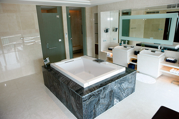 Phòng tắm được thiết kế với một bể sục lớn, hai buồng tắm đứng và bàn trang điểm lớn ở cạnh cửa sổ.