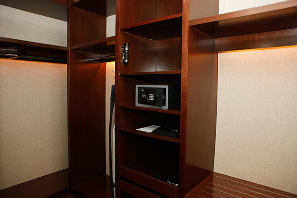 Hai tủ quần áo riêng biệt với đầy đủ các thiết bị như tủ bảo mật, áo ngủ, dù, đèn pin, mắc treo, dép đi trong phòng.