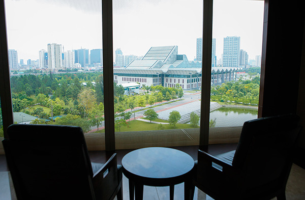 Góc nhìn ra Trung tâm hội nghị Quốc gia từ cửa sổ bàn họp.