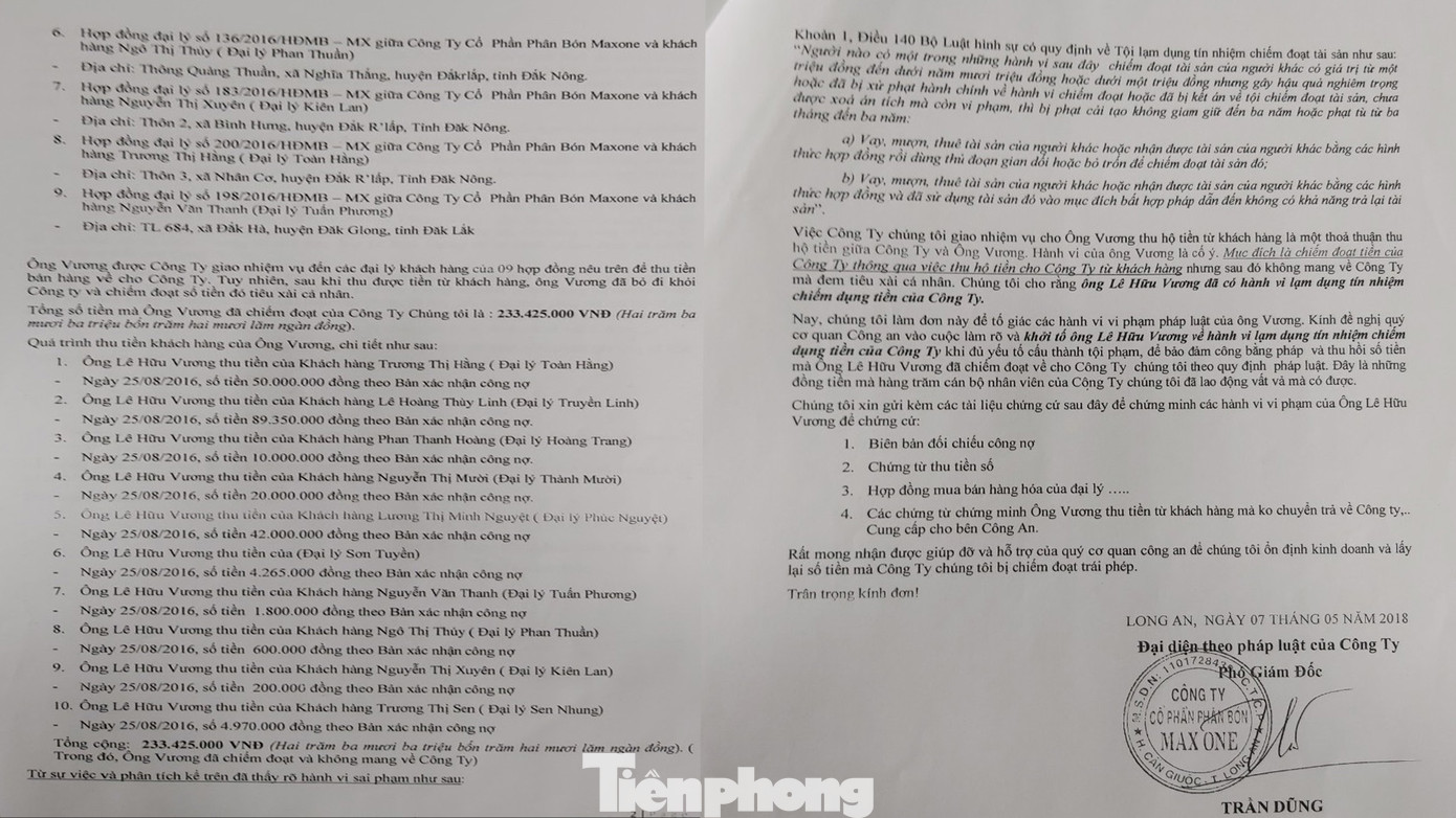 Đơn tố giác tội phạm của Cty Cổ phần phân bón Maxone (Cty Maxone, trụ sở tại tỉnh Long An) nêu: Năm 2016, ông Lê Hữu Vương (SN 1989, trú tại tổ dân phố 5, TX Gia Nghĩa (nay là TP Gia Nghĩa), tỉnh Đắk Nông) thu hơn 233 triệu đồng từ 10 đại lý phân bón trên địa bàn tỉnh Đắk Nông, nhưng không nộp về công ty, mà đem tiêu xài cá nhân. Thời điểm này, ông Vương đang là nhân viên kinh doanh của công ty này.