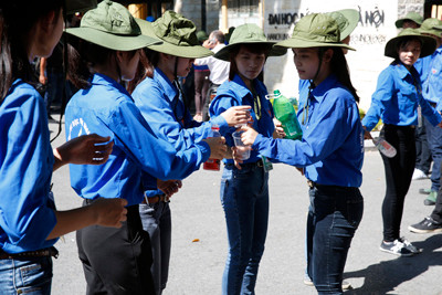 Các thanh niên tình nguyện chia sẻ nước uống.