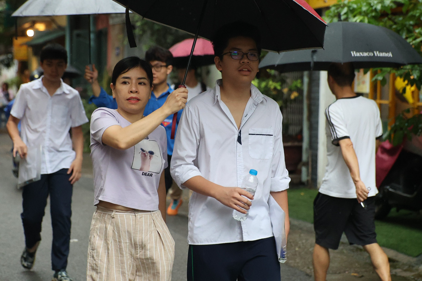 Thời tiết mưa gió các em học sinh được mẹ che ô cho vào cổng trường thi. Ảnh: Như Ý