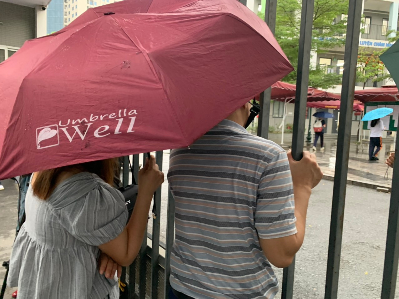 40 tình nguyện viên của Trường THPT Khương Đình và bên điểm Trường Khương Hạ mang ô che cho các thí sinh trước khi vào điểm thi. Ảnh: Như Ý