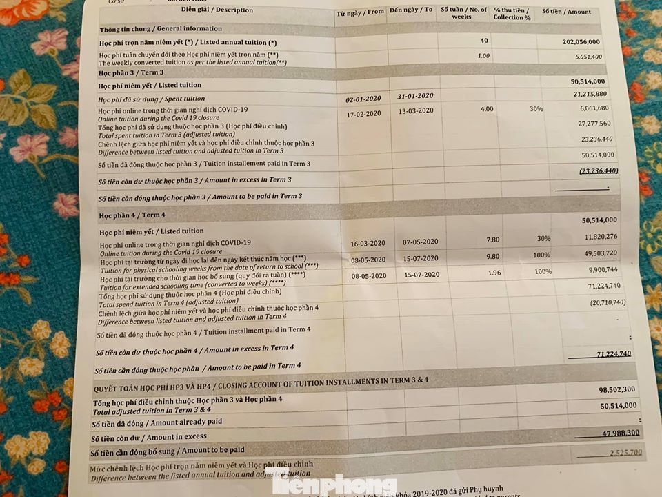Tổng số học phí phụ huynh phải đóng cho học phần 4 là hơn 71 triệu đồng. Cao hơn so với học phí niêm yết khoảng 20 triệu đồng.