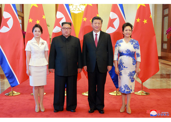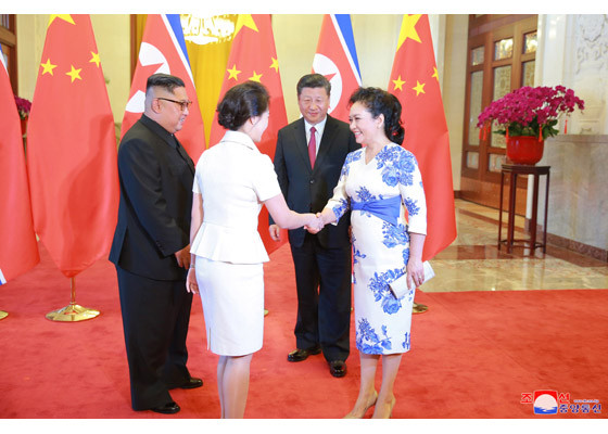 Sau đó, bà Ri cùng phu quân di chuyển đến Đại lễ đường Nhân dân (Bắc Kinh) để gặp Chủ tịch Trung Quốc Tập Cận Bình và phu nhân Bành Lệ Viện. Ảnh: Rodong Sinmun