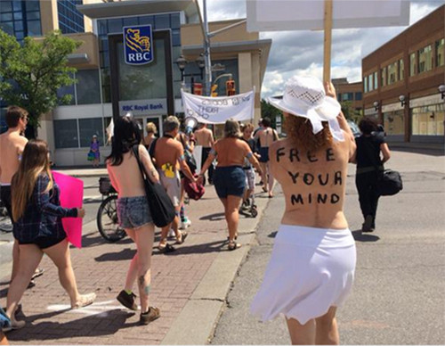 Phụ nữ ở Ontario được quyền bán khỏa thân nơi công cộng kể từ năm 1996. Tuy nhiên, "họ vẫn chưa thực sự thỏa mái để làm điều đó khi đối mặt với sự quấy rầy từ những người qua lại và trong một số trường hợp là từ các cảnh sát thiếu hiểu biết", các nhà tổ chức cuộc biểu tình nói.