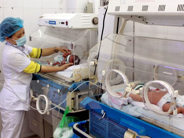 Nhân viên y tế chăm sóc sức khỏe cho trẻ sơ sinh, (Ảnh: TTXVN)