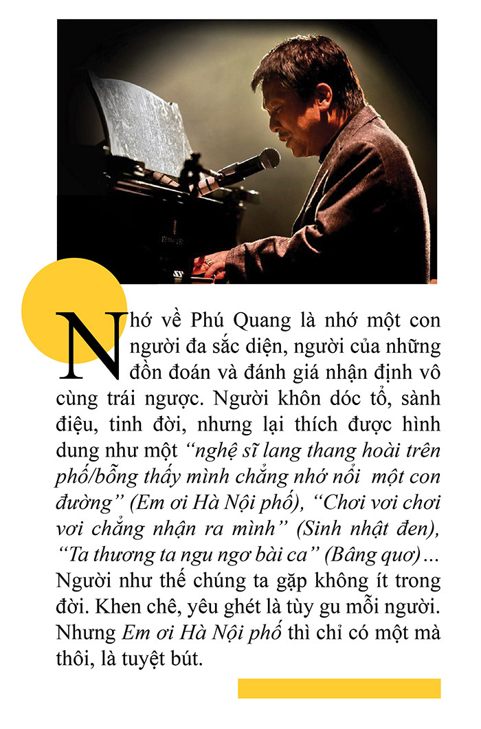 Đó là một nhạc sĩ của Hà Nội, viết nhiều và hay nhất về Hà Nội. Tấm danh thiếp này dễ đâu có được. Nhạc sĩ nhiều người tài lắm, trong đó, số viết hay về Hà Nội không ít, nhưng khán giả sẽ định vị họ kiểu khác so với Phú Quang. Em ơi Hà Nội phố đã đành, mà ngay những bài không một dòng nhắc Hà Nội nhưng nghe biết ngay, là viết về điều gì đây: Nỗi nhớ mùa đông, Trong miền ký ức..v.v...