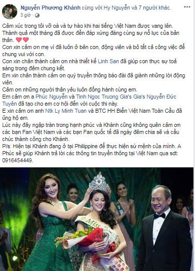 Chia sẻ sau chiến thắng trên trang Facebook cá nhân, Nguyễn Phương Khánh xúc động viết: