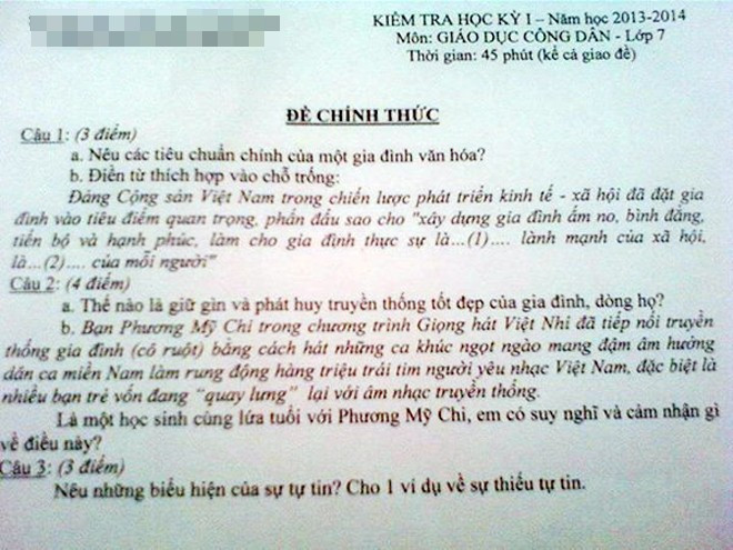 Nội dung ở câu 2b trong đề thi này như sau: “Bạn Phương Mỹ Chi trong chương trình Giọng hát Việt nhí đã tiếp nối truyền thống gia đình (cô ruột) bằng cách hát những ca khúc ngọt ngào mang đậm âm hưởng dân ca miền Nam làm rung động hàng triệu trái tim người yêu nhạc Việt Nam, đặc biệt là nhiều bạn trẻ vốn đang “quay lưng” với âm nhạc truyền thống. Là một học sinh cũng trang lứa tuổi với Phương Mỹ Chi, em có suy nghĩ và cảm nhận gì về điều này?”.