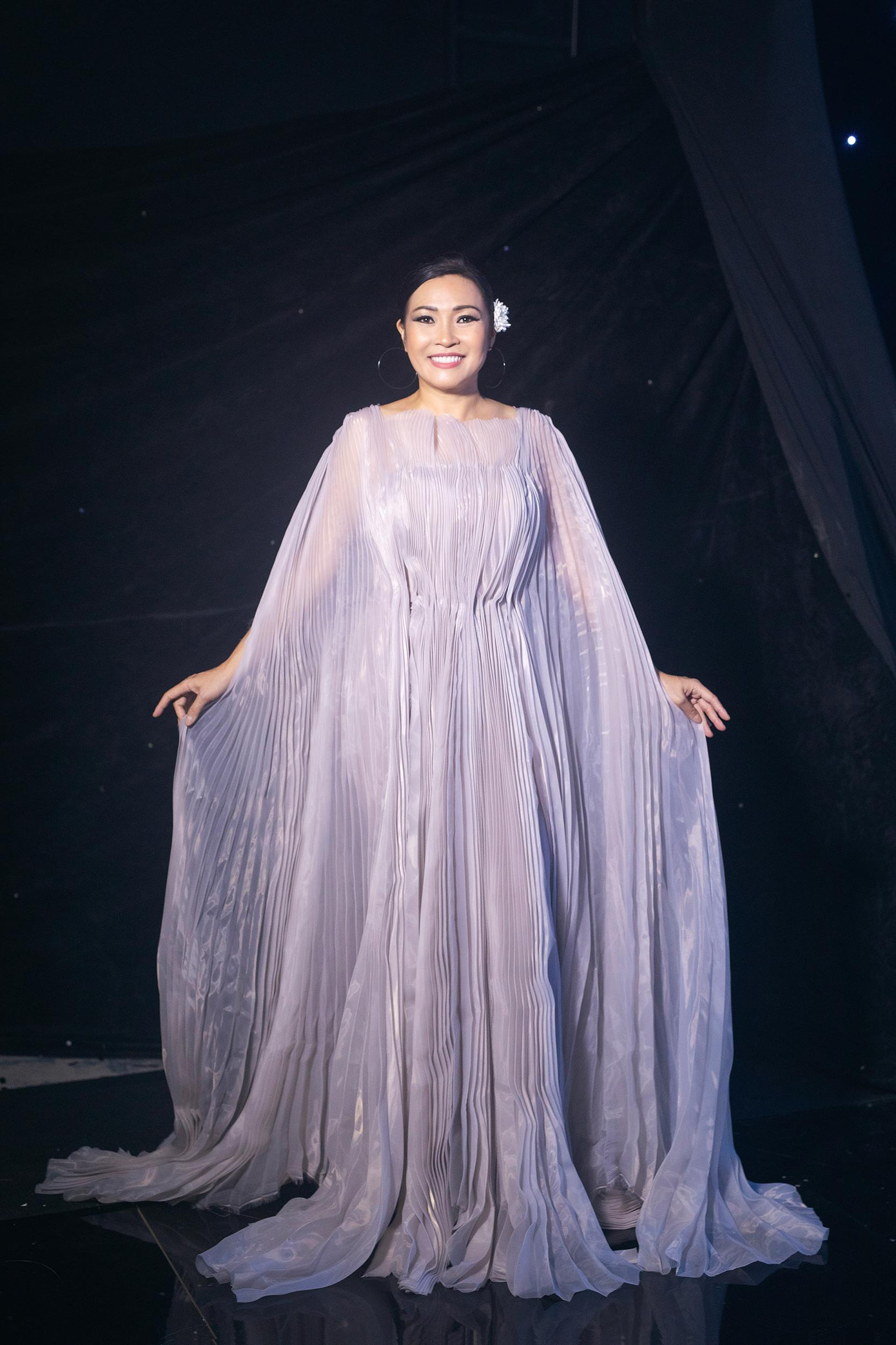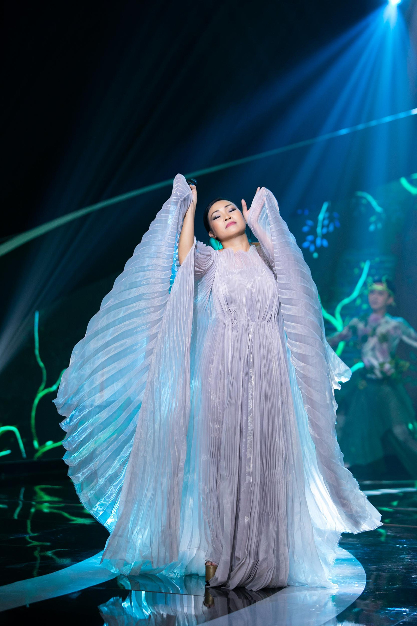 Trong chương trình, ca sĩ Phương Thanh diện chiếc đầm xếp ly dài màu trắng ngà, tung bay giữa nền sân khấu xanh đậm.
