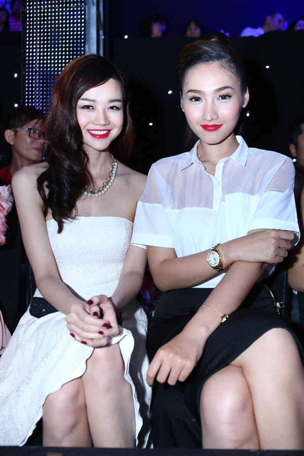 Hai người mẫu Kiều Ngân và Tô Uyên Khánh Ngọc cùng chọn sắc trắng thanh lịch để tới xem chương trình.