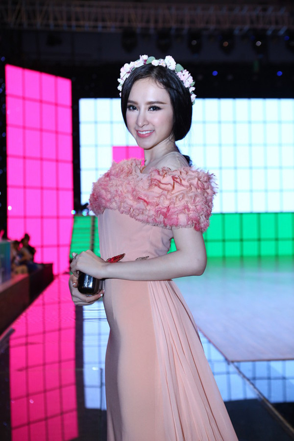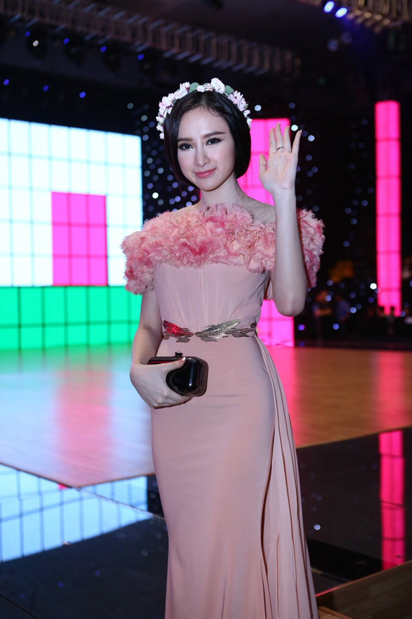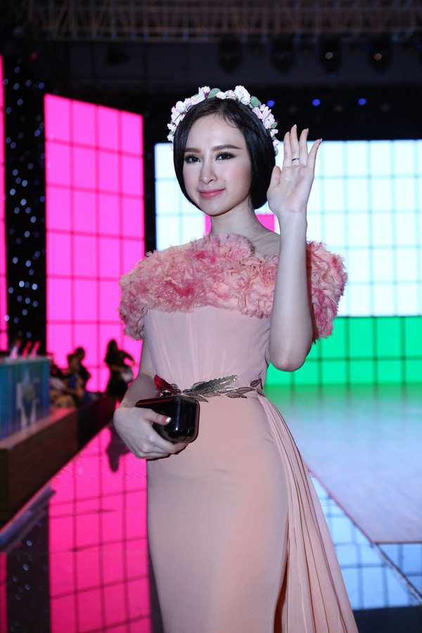 Tối 1/3, Angela Phương Trinh diện bộ váy hồng có thiết kế cầu kỳ, xa hoa tới xem liveshow 7 Bước Nhảy Hoàn Vũ.