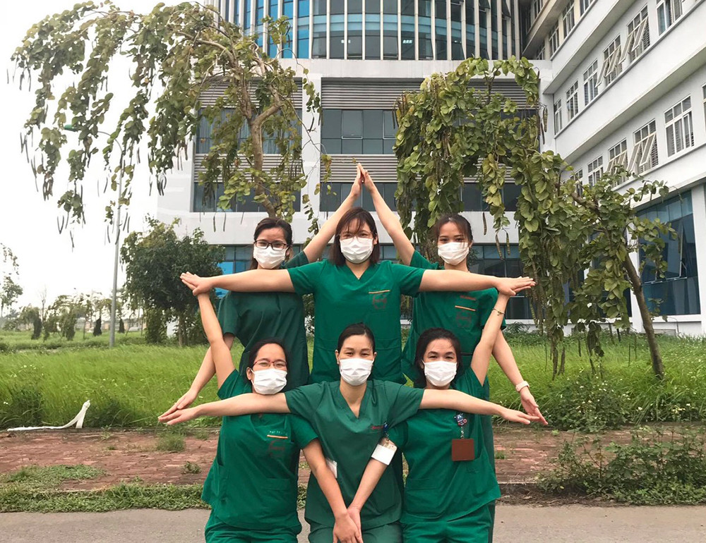 Các nữ y, bác sĩ Bệnh viện Nhiệt đới Trung ương cơ sở 2 xếp hình ngôi sao, thể hiện niềm tin sẽ chiến thắng đại dịch COVID-19