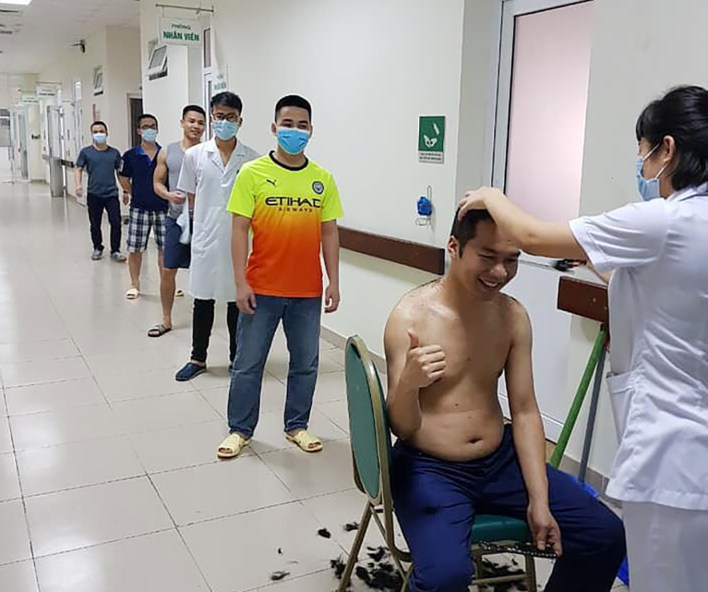 Các y, bác sĩ nam xếp cắt tóc sau ca trực