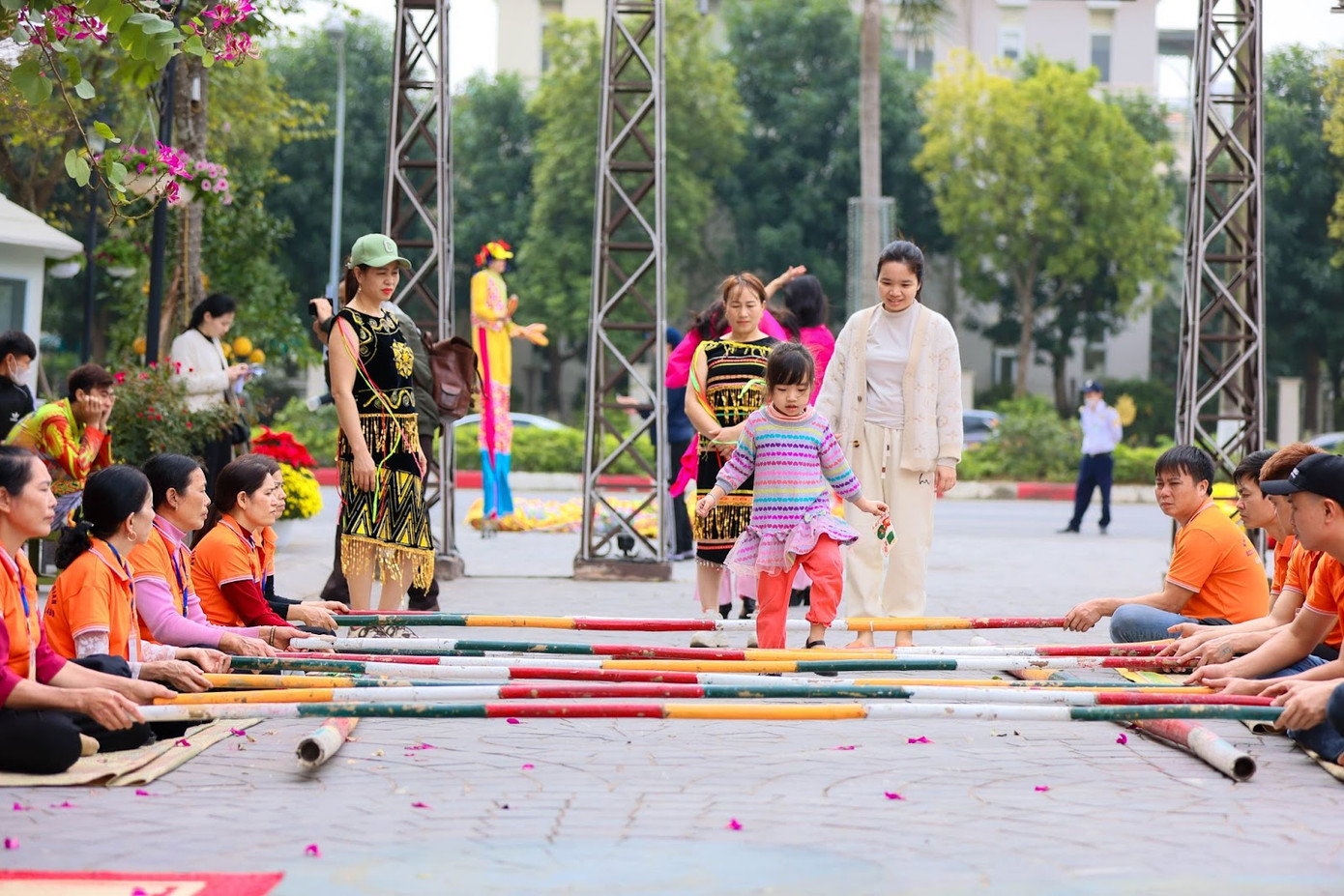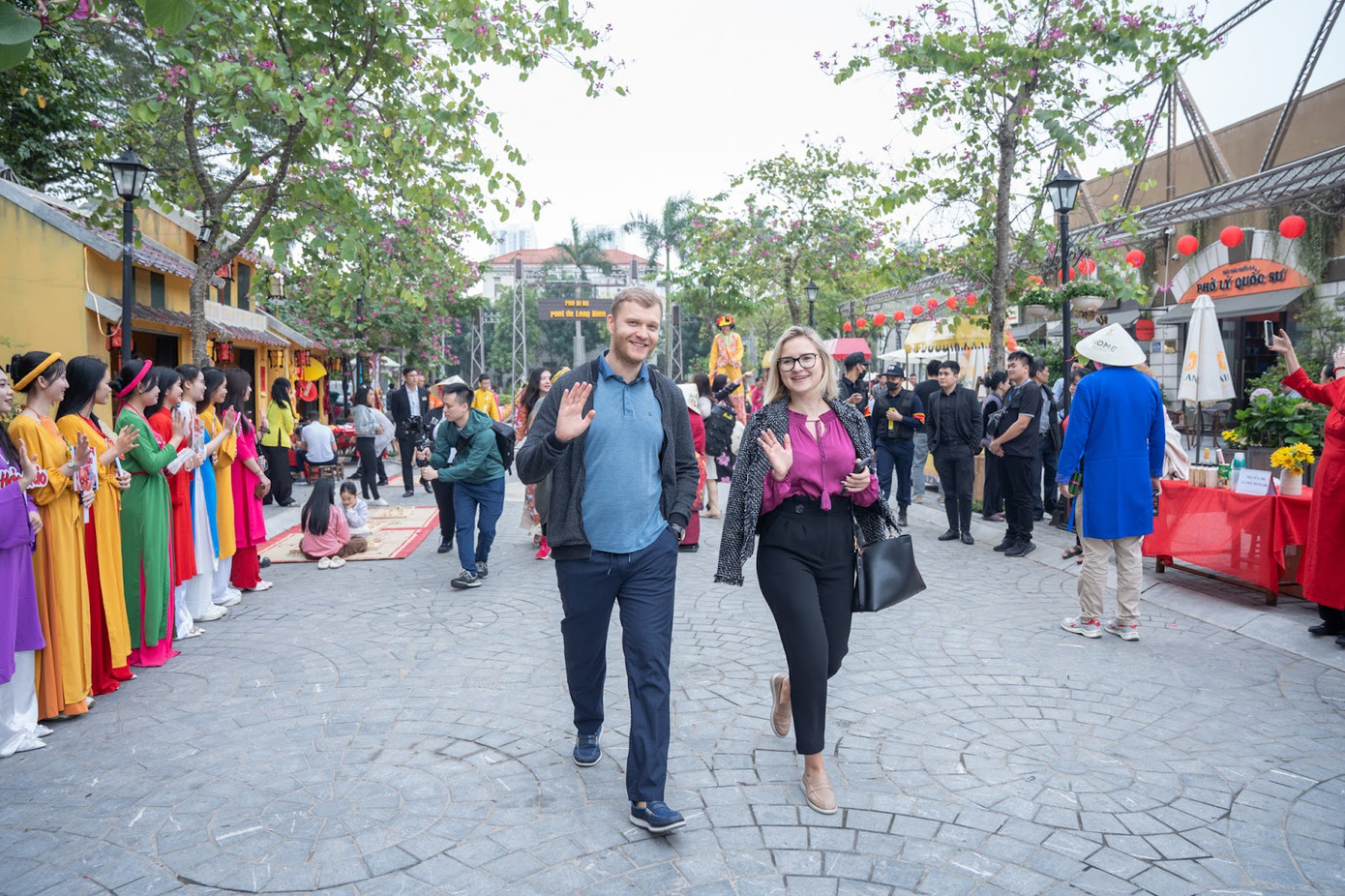 Nhiều bạn trẻ diện áo dài rực rỡ, check-in tại phố đi bộ Pont de Long Biên. Tiếp nối phố đi bộ Pont de Long Bien, tuyến phố Văn Hiến mới đi vào hoạt động cũng gia tăng không gian và trải nghiệm của du khách với những hoạt động hấp dẫn khác. Gần 50 gian hàng bao gồm: ăn uống, thủ công mỹ nghệ, quà tặng lưu niệm, hàng nông sản, hàng hóa Tết… phục vụ du khách từ nay đến hết ngày 14/2.