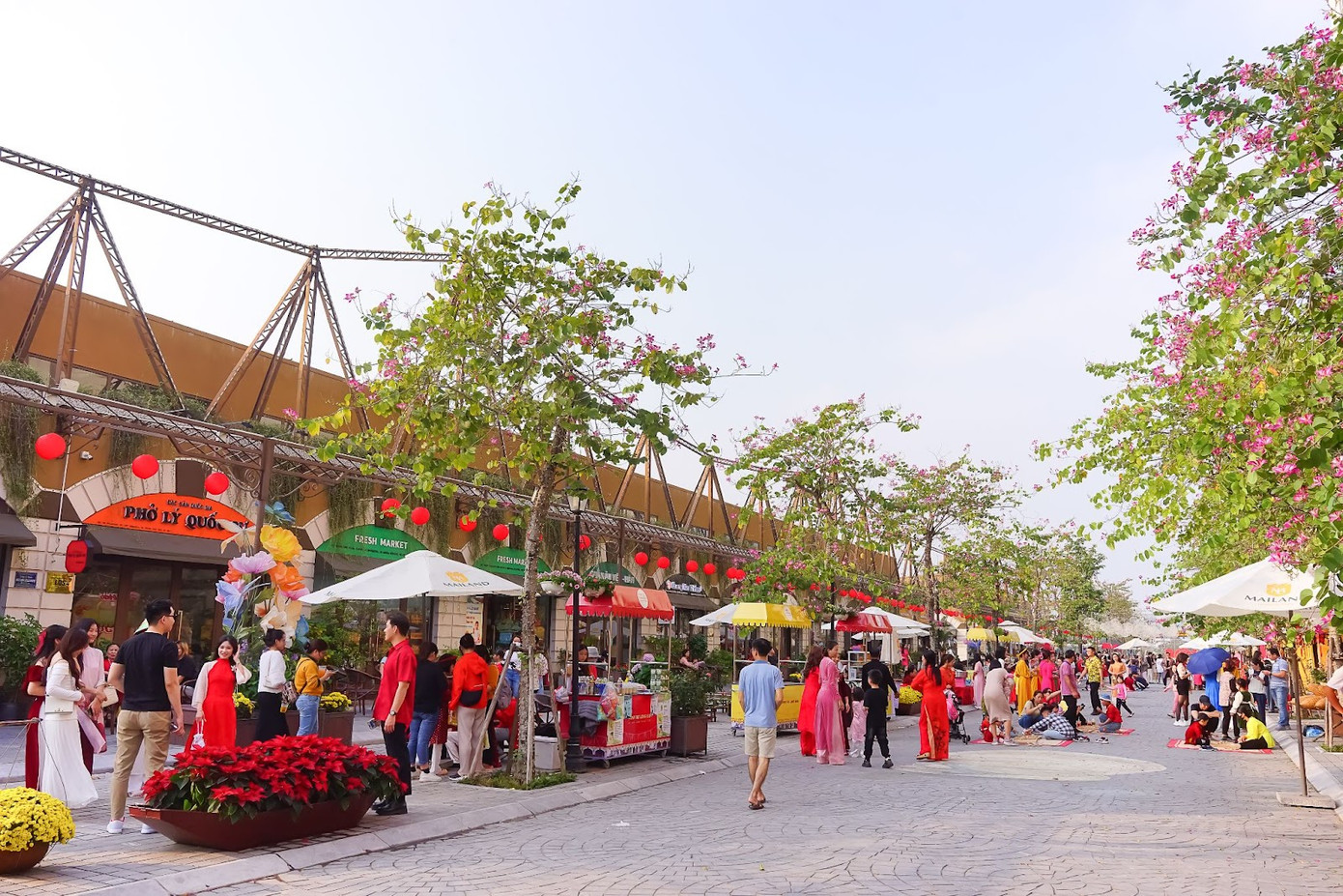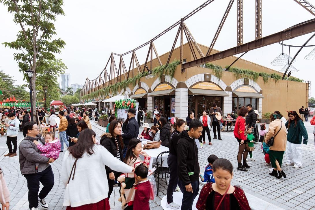 Trong dịp Tết Giáp Thìn này, bên cạnh đường hoa Home Hanoi Xuan 2024, phố đi bộ Pont de Long Biên tại Mailand Hanoi City (Bắc An Khánh, Hoài Đức) mở cửa tự do từ 8h30 – 21h nhằm chào đón cư dân, du khách tới tham quan, trải nghiệm trong suốt 11 ngày (3/2 đến 14/2).