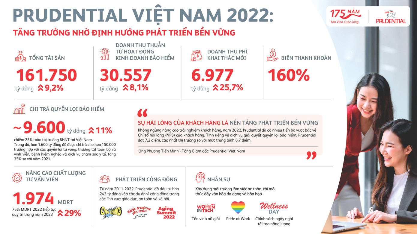 Ông Phương Tiến Minh – Tổng Giám đốc Prudential Việt Nam nhấn mạnh: “Chặng đường 2 năm 2020-2021 là thời gian chúng tôi củng cố, tái thiết đội ngũ và hệ thống vận hành. Năm 2022 là lúc chúng tôi tăng tốc phát triển kể cả về quy mô lẫn chất lượng. Chúng tôi kết thúc năm 2022 với hàng loạt những chỉ số kinh doanh vượt trên kỳ vọng nhưng quan trọng hơn cả chính là những chỉ số về khách hàng như Net Promoter Score – chỉ số mức độ hài lòng của khách hàng ở mọi điểm tương tác.”