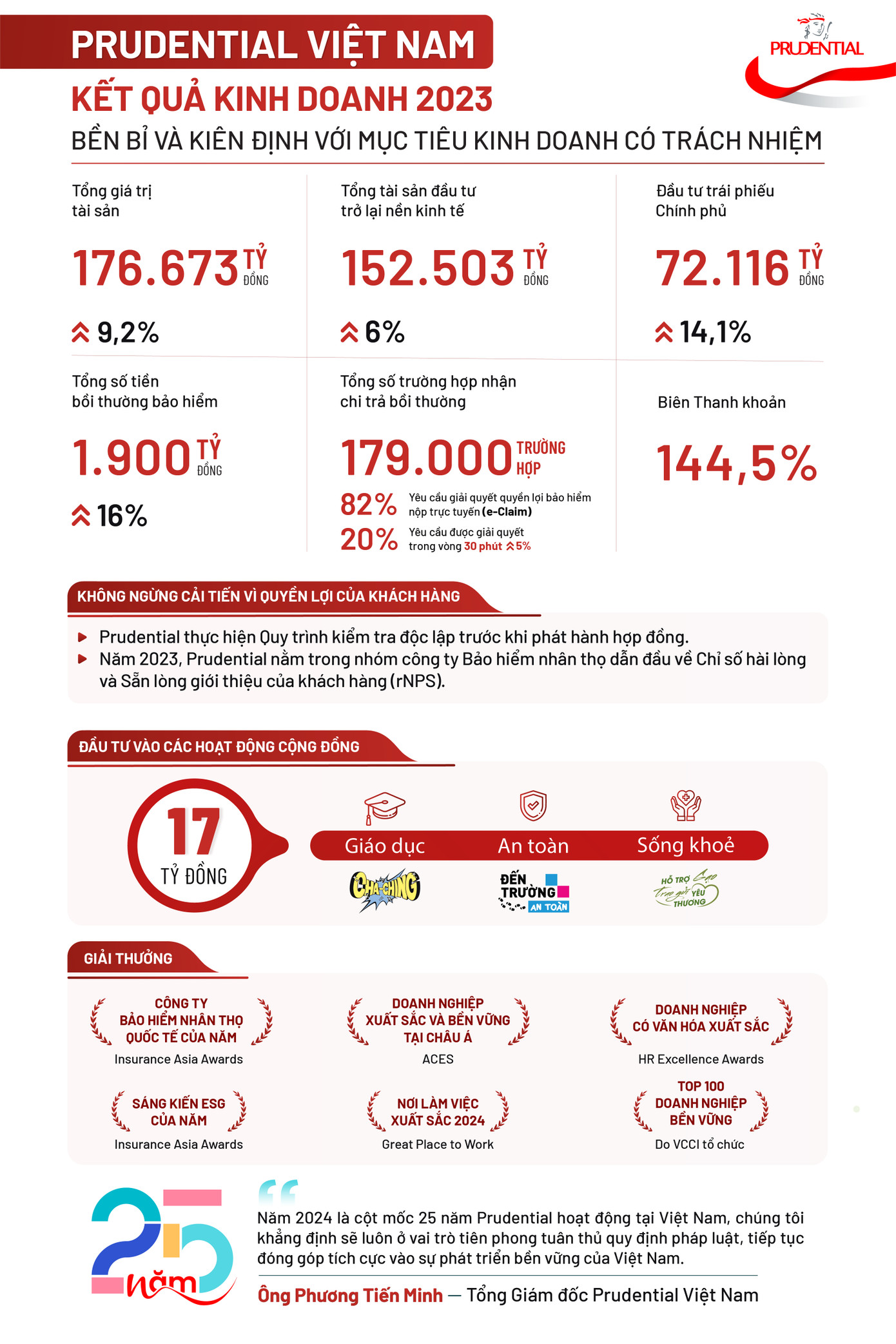 Tổng Giám Đốc Prudential Việt Nam – ông Phương Tiến Minh cho biết: “Những thách thức tạm thời của năm 2023 mở ra cơ hội để chúng tôi tập trung nâng cao chất lượng dịch vụ khách hàng và cải thiện chất lượng của các kênh phân phối. Sự ra đời đúng thời điểm của Luật Kinh doanh bảo hiểm mới giúp toàn ngành bảo hiểm đánh giá lại và cải tiến để trở nên tốt hơn, hướng tới quyền lợi của người tham gia bảo hiểm. Chúng tôi sẽ tiếp tục đầu tư vào các hoạt động cần thiết để đảm bảo sự tuân thủ, tăng cường chất lượng bán hàng, cũng như nâng cao trải nghiệm cho khách hàng của mình”.