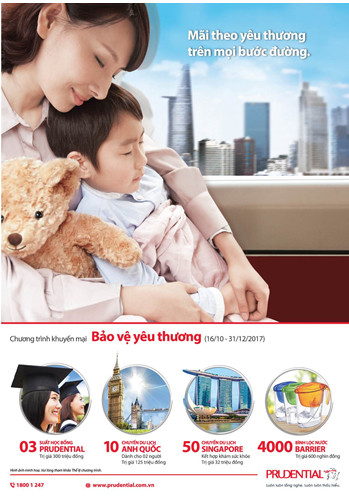 Theo đó, khi khách hàng mua một (01) sản phẩm chính có phí bảo hiểm quy năm từ 15 triệu đồng và mua thêm ít nhất 05 sản phẩm gia tăng bảo vệ sẽ được tặng 01 Mã số dự thưởng (MSDT) để có cơ hội nhận được một trong các giải thưởng sau: 03 học bổng Prudential trị giá 300 triệu đồng mỗi giải, 10 chuyến du lịch Anh Quốc dành cho 02 người trị giá 125 triệu đồng mỗi giải, 50 chuyến du lịch Singapore kết hợp khám sức khỏe tổng quát trị giá 32 triệu đồng mỗi giải.