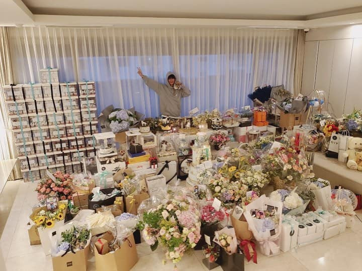 Được biết, đây là phòng khách tại công ty đại diện của Lee Min Ho, anh từng nhắn nhủ fan trước đó là đừng gửi quá nhiều đồ cho anh trong ngày sinh nhật. Tất cả số lượng bánh kẹo anh nhận được sẽ được chuyển cho các tổ chức từ thiện dành cho trẻ em.