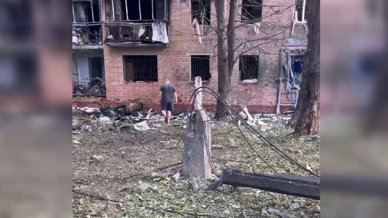 | Tòa chung cư bị hư hại vì quả đạn rơi trúng. (Ảnh: RT) |