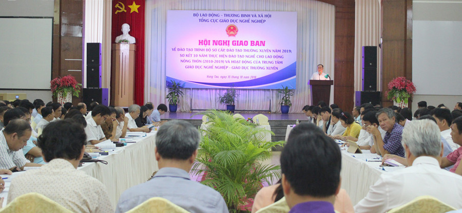 Tổng Cục Giáo dục Nghề nghiệp (Bộ LĐ-TB&XH) vừa tổ chức Hội nghị giao ban về đào tạo trình độ sơ cấp, đào tạo thường xuyên năm 2019, sơ kết 10 năm thực hiện Đề án đào tạo nghề cho lao động nông thôn (2010 – 2019) và hoạt động của trung tâm Giáo dục Nghề nghiệp. Hội nghị diễn ra tại Bà Rịa - Vũng Tàu.