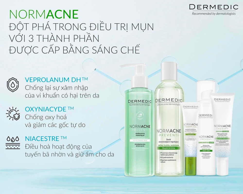 Dòng sản phẩm Normacne của Dermedic là dược mỹ phẩm đầu tiên trên thị trường hoạt động theo cơ chế tác động vào toàn bộ các nguyên nhân và giai đoạn của mụn trứng cá, với khả năng ngăn ngừa, chăm sóc và phục hồi tổn thương da dầu mụn, mang lại hiệu quả rõ rệt trên làn da bị tổn thương do mụn chỉ sau 27 ngày sử dụng.