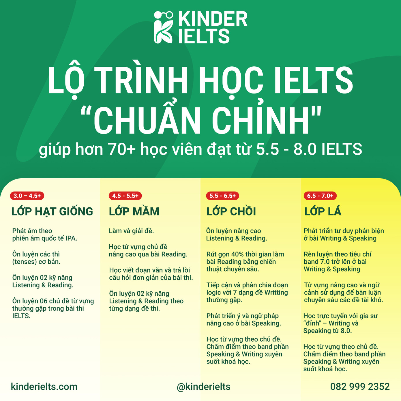 Kinder IELTS là lớp học online kiểu mới, các bài giảng được thiết kế đặc biệt giải quyết vấn đề của các bạn học sinh Việt Nam khi ôn luyện IELTS. Các cấp lớp tại Kinder IELTS được phân hóa rõ ràng, giúp học viên dễ dàng bắt kịp và hiểu sâu bài học.