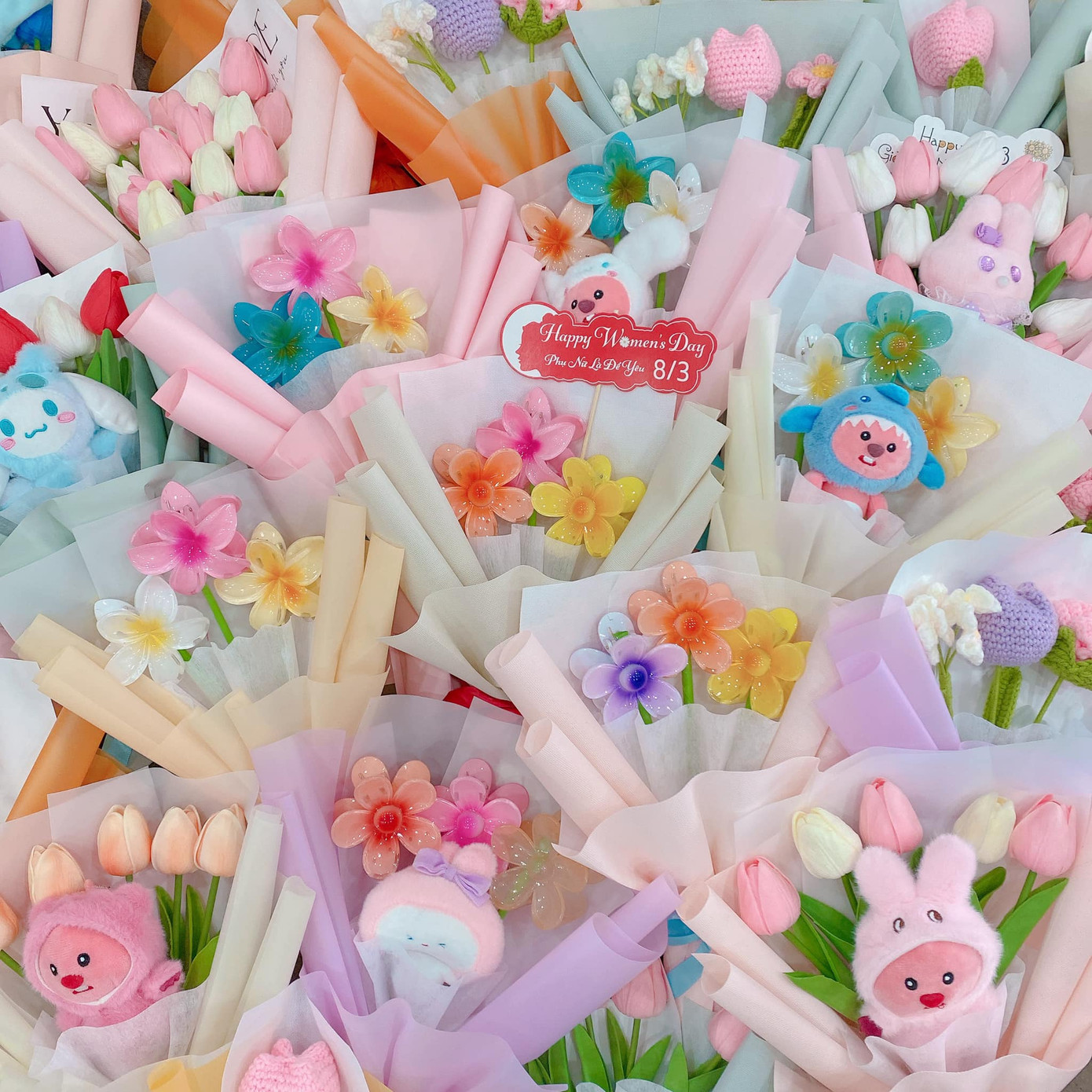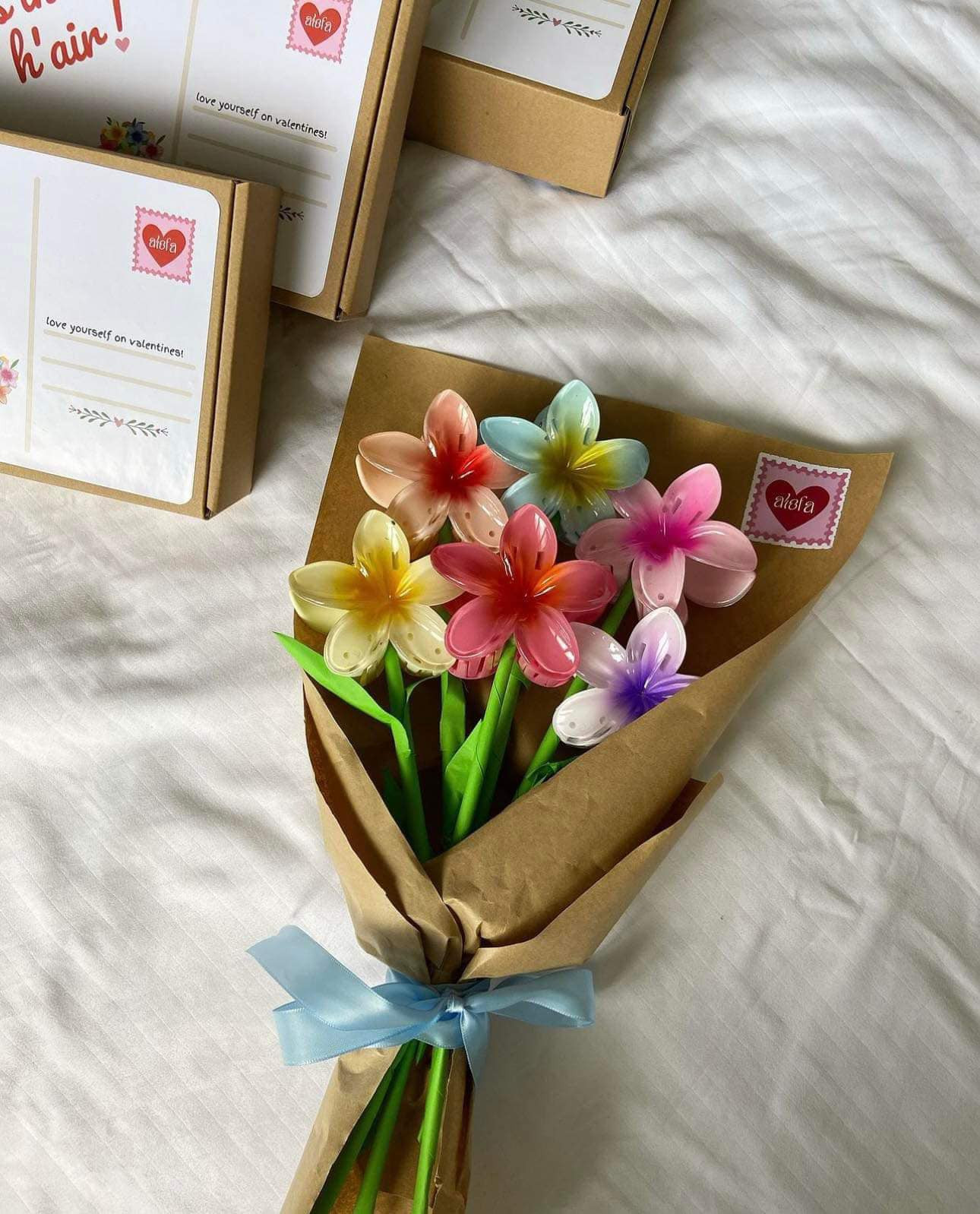 Cũng không nhất thiết phải đặt mua bó hoa sẵn, bất cứ ai cũng có thể tự bó hoa tại nhà. Tất cả những gì bạn cần là giấy, kẽm nhung... để làm thân hoa, sau đó kẹp cài tóc lên trên là đã hoàn thành một bó hoa dễ thương. Bạn cũng có thể đính thêm những phụ kiện gấu bông nhỏ để tạo điểm nhấn.