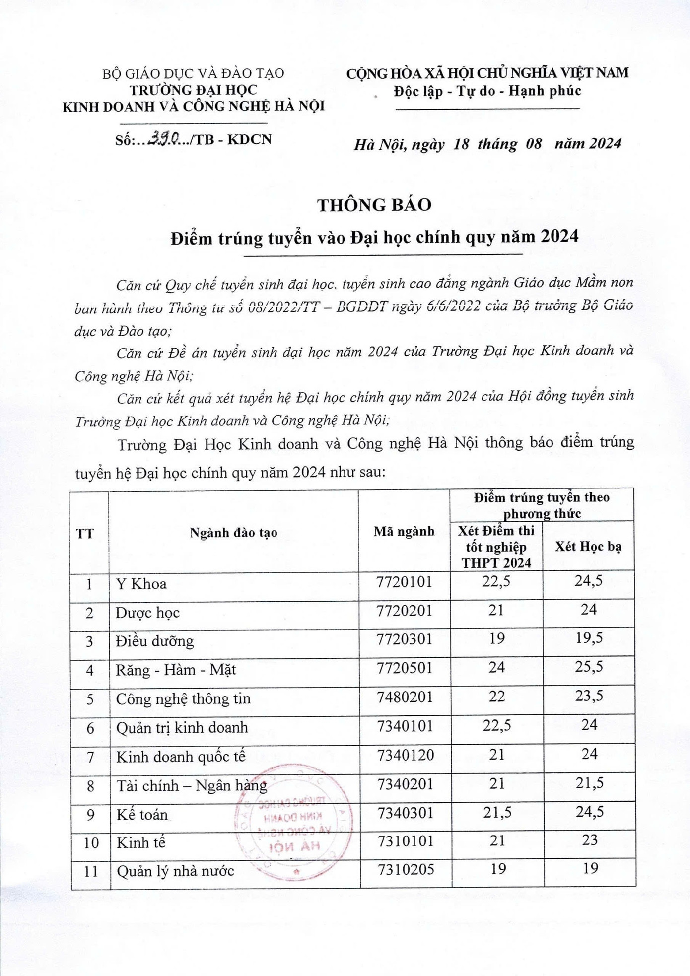 Theo đó, ngày 18/8 theo lộ trình quy định của Bộ Giáo dục, Trường Đại học Kinh doanh và Công nghệ Hà Nội đã công bố điểm trúng tuyển của 27 ngành đào tạo theo 2 phương thức xét tuyển: Xét điểm thi tốt nghiệp THPT 2024 (Đã bao gồm điểm ưu tiên theo quy định) và Xét học bạ THPT (Không bao gồm điểm ưu tiên).