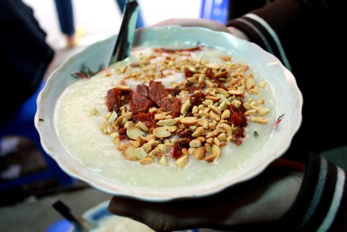 Cháo ở đây hơi sánh và có màu vàng nhẹ của đậu xanh nấu nguyên hạt. Khi kết hợp cùng bò khô và lạc rang, món này càng trở nên hấp dẫn hơn. Một bát cháo nghi ngút khói sẽ giúp bạn xua đi cái lạnh giá của mùa đông Hà Nội. Giá một bát là 15.000 đồng.