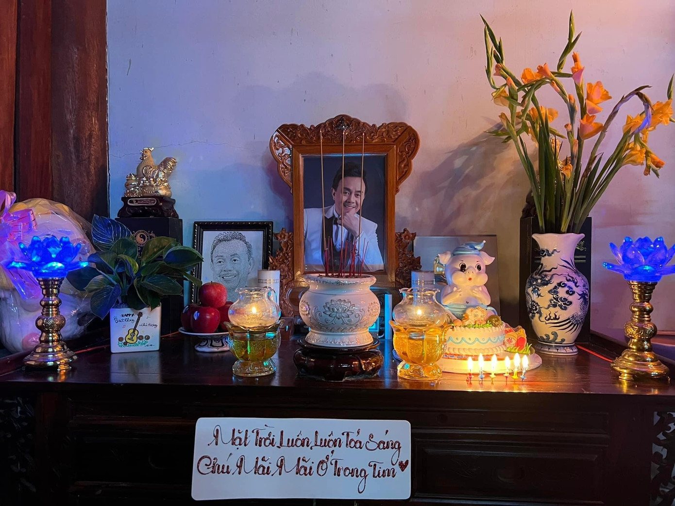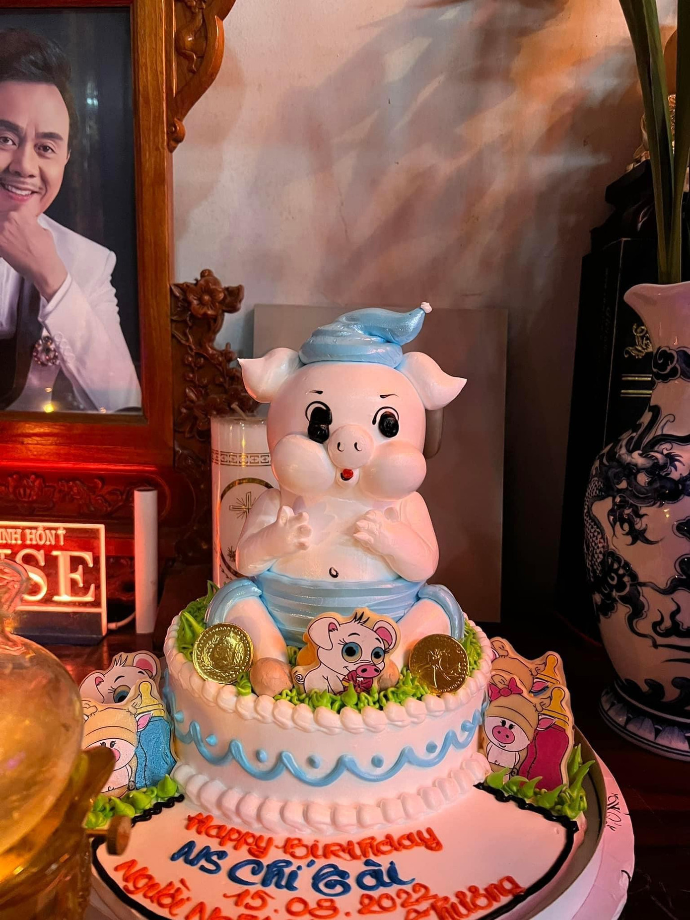 Trên trang cá nhân, diễn viên Quách Ngọc Tuyên đã đăng những hình ảnh chúc mừng sinh nhật vị tiền bối quá cố cùng chiếc bánh kem hình con heo khiến nhiều khán giả xúc động.