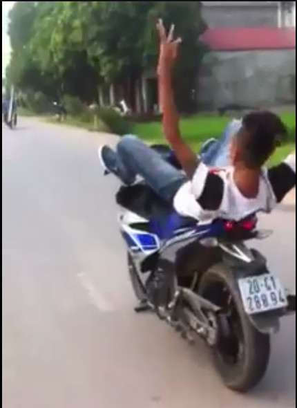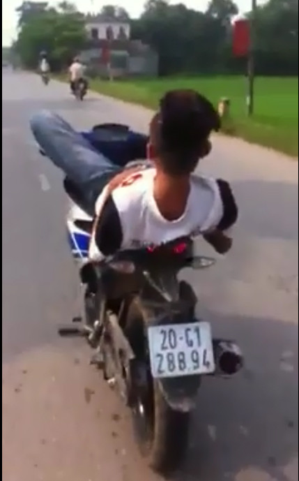Đoạn video dài hơn 1 phút được đăng tải trên mạng facebook ghi lại hình ảnh nam thanh niên không đội mũ bảo hiểm điều khiển xe máy Exciter BKS 20G1-288.94... bằng chân được cho là xảy ra tại Phú Bình, Thái Nguyên.