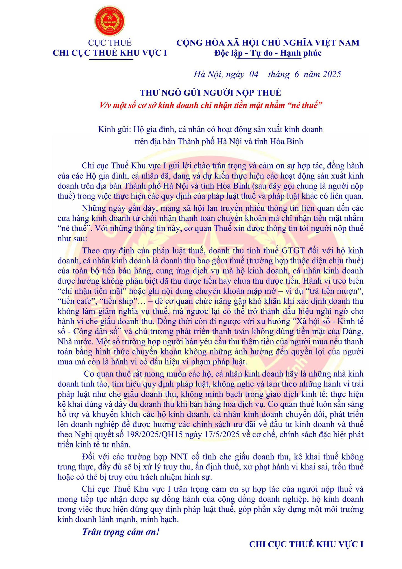 Trước tình trạng trên, Chi cục Thuế khu vực I (quản lý khu vực Hà Nội và Hòa Bình) đã có thư ngỏ gửi các hộ gia đình, cá nhân có hoạt động sản xuất, kinh doanh trên địa bàn thành phố Hà Nội và tỉnh Hòa Bình: