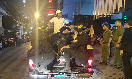 Rạng sáng 28/4, một đoạn đường Nam Quốc Cang, phường Phạm Ngũ Lão (quận 1), nơi có quán bar 030-X8, bị hàng trăm cảnh sát thuộc Phòng Cảnh sát quản lý Hành chính về trật tự (PC64) Công an TP HCM, cảnh sát hình sự, cơ động, CSGT, phòng chống ma tuý, 113... phong toả từ nhiều hướng.
