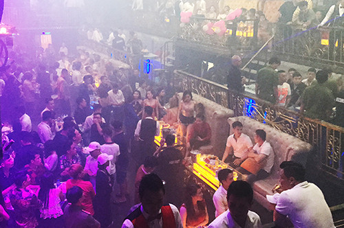 Bên trong, hàng trăm khách đang nhảy múa, uống rượu trong tiếng nhạc cực mạnh. Cảnh sát ập vào một lúc, nhân viên quán bar và các dân chơi mới phát hiện. Nhạc tắt, đèn vụt sáng... mọi người nhốn nháo.