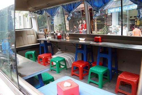 Theo lý giải của chủ cửa hàng: Do không gian bên trong nhà chật hẹp, lại không thể lấn chiếm vỉa hè, một chủ quán bán bún chả trên phố Phạm Sư Mạnh (Hoàn Kiếm, Hà Nội) đã nghĩ ra cách cải tạo bên trong một chiếc xe khách làm nơi để khách ngồi ăn bún chả.